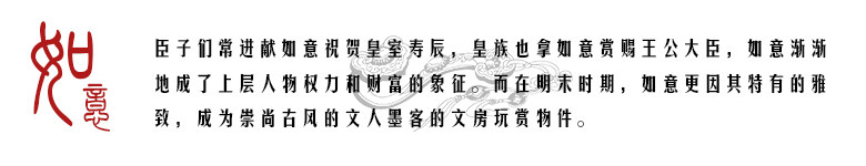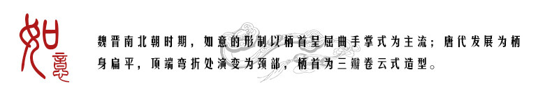如意’的形状:有略似‘心’字形的,这是用表妙心之义。另有如龙爪状的,这则是依据净名经义钞的典故而来的。该义钞略说;牛司尊者,说法时因有口病,恐大众讥笑;有龙现爪,以遮其口。