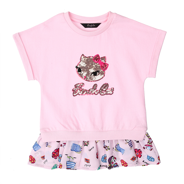 .■상세설명: ; ;얇은 쭈리 다이마루로 만들어진 핑크 컬러의 맨투맨 티셔츠입니다. 밑단에는 키치하고 톡톡 튀는 느낌의 핑크 나염 원단으로 프릴단을 달아 주었습니다. 블링블링한 골드 고양이 자수와 로고 포인트로 귀여운 느낌을 주었습니다. 레깅스, 우븐 바지와 코디하시기 좋습니다.