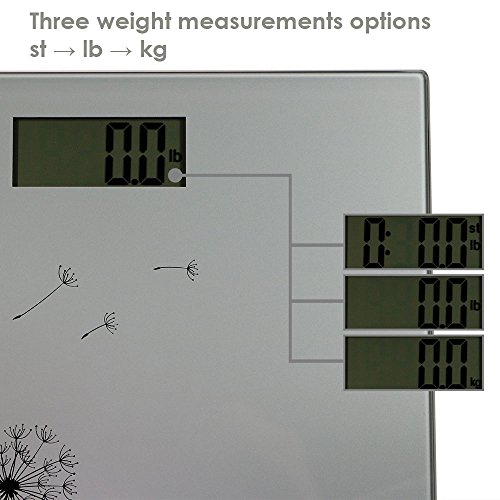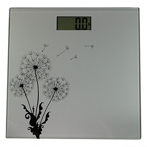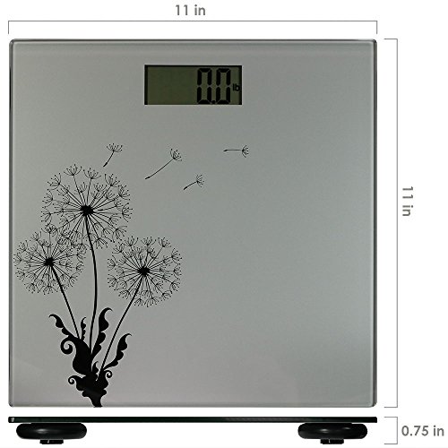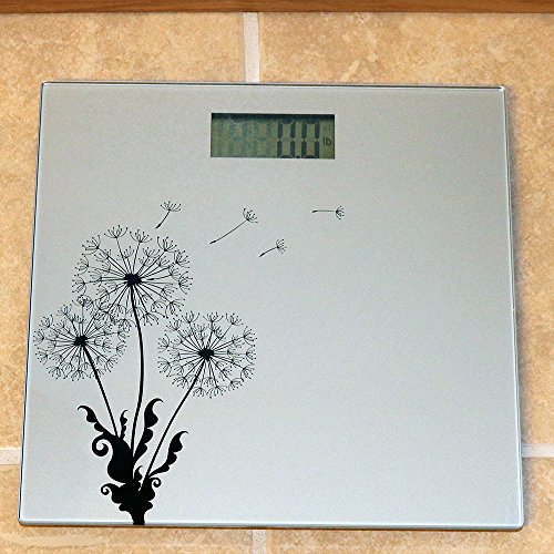 -. Title : Sunnydaze Precision Digital Glass Bathroom Scale with Step-On Technology and Large LCD Display, Silver Dandelion Design