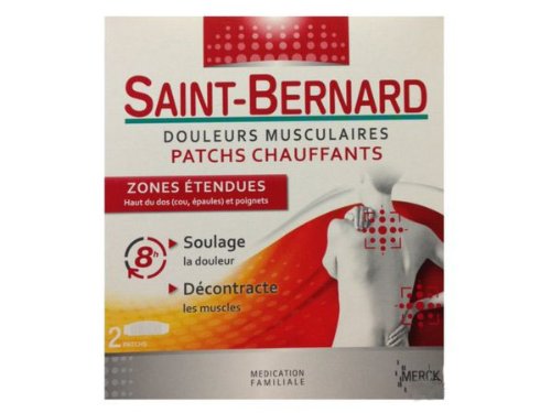 -. Binding : Health and Beauty -. Brand : Saint Bernard -. EAN : 3401052034697 -. Feature : Saint-Bernard Muscular Pain Heating Patches 2 Patches alleviates pain and relaxes muscles on extended areas : - Top of the back (neck, shoulders)- Wrist. / The patch spreads 8 hours of soothing heat and alleviates muscular pain located on the top of the back (neck, shoulders) and wrist. / After the application, blood circulation is accelerated and rigidity is reduced. / Fragrance-free and discreet, it can be worn at any time. -. Label : Saint-Bernard -. Manufacturer : Saint-Bernard -. Model : 8694A -. MPN : 5203469 -. PackageQuantity : 1 -. PartNumber : 5203469 -. ProductGroup : Health and Beauty -. ProductTypeName : HEALTH_PERSONAL_CARE -. Publisher : Saint-Bernard -. Studio : Saint-Bernard -. Title : Saint-Bernard Muscular Pain Heating Patches 2 Patches