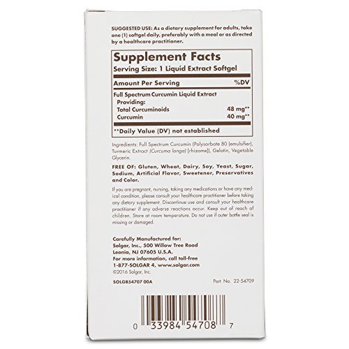 More, better, faster. Thatrsquo;s the difference with Solgar Full Spectrum Curcumin. In fact, the bioavailability is 185x better. For the first time, Solgar transforms poorly absorbed curcumin, from a fat-soluble to a water-soluble phytonutrient. making it immediately body-ready, faster absorbed and more active than ever before. Itrsquo;s so advanced, just 40 mg of curcumin in one softgel delivers the equivalency of nearly 75 (100 mg) capsules of standardized curcumin extract. Even more, in a recent clinical study, Solgar Full Spectrum Curcumin was shown to be longer lasting so it stays in your system for a full 24 hours. Now, for brain, joint, and immune health ndash; Solgar changes what you believed was possible from Curcuminhellip;forever. Solgar Full Spectrum Curcumin. one softgel, once a dayndash;185x better.