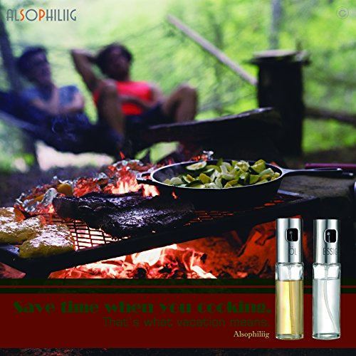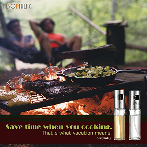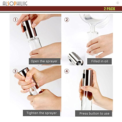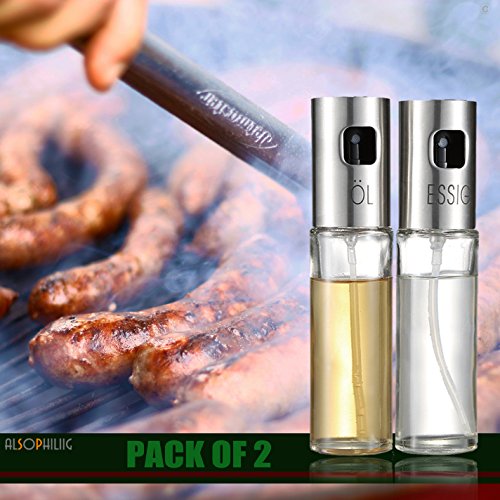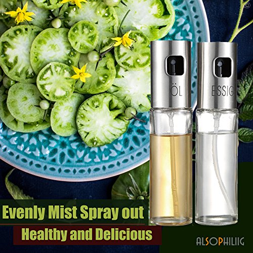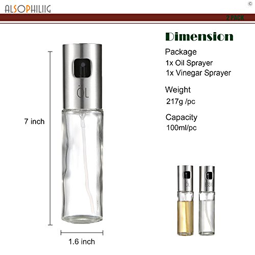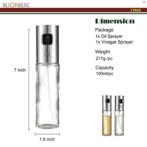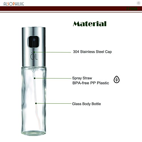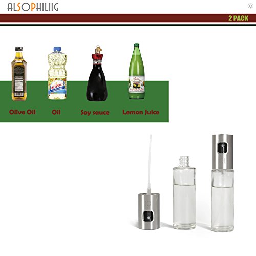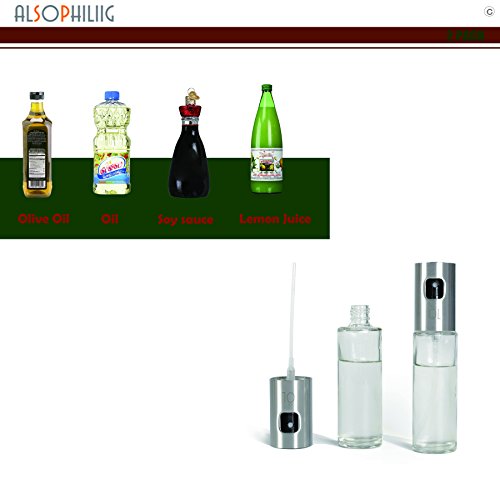Studio : alsophiliig Publisher : alsophiliig Product Description Olive Oil Sprayer and Vinegar Dispenser Lemon Juice Spray Mister with Stainless Steel Pump Cap Glass Bottle Label for Baking Salad Dressing Camping