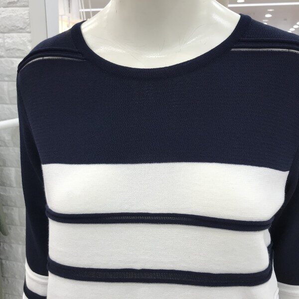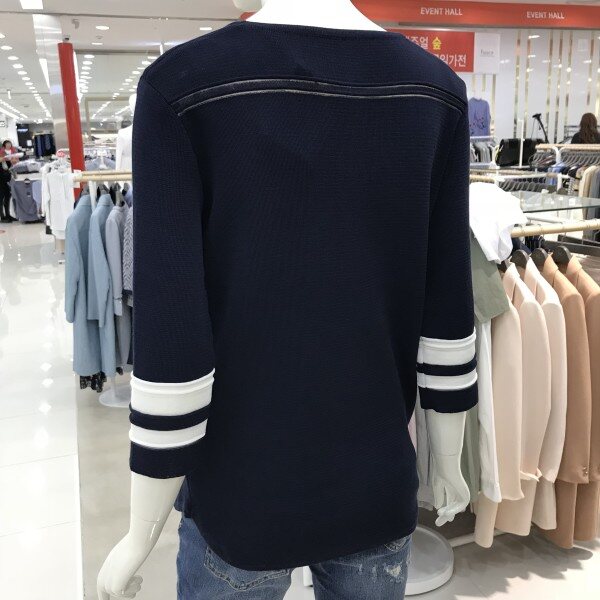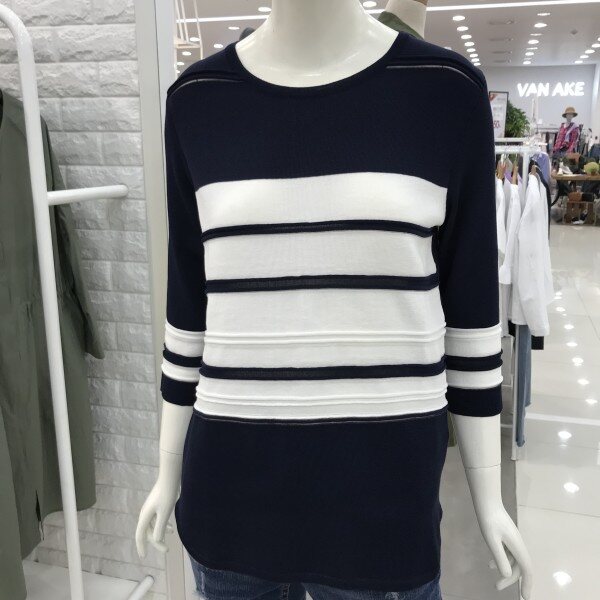 줄무늬 패턴이 화사한 기본니트입니다칠부소매에 톡톡한 두꺼감이라 하나만입어도 깔끔합니다