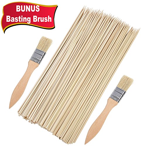 BONUS 2 Natural Bristle Basting Brushes - Bamboo Marshmallow Smores Roasting Sticks 12 Inch, Heavy Duty Wooden Skewers, 100 Pieces, Perfect for Hot Dog Kebab Sausage, Environmentally Safe