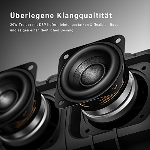 Reichhaltiger Klang: Prasentiert einen vollen und reichen Klang mit kraftigem Bass und klarem Gesang, dank einem Paar passiver Resonatoren, einem Paar Class-D Verstarkern und zwei 10W Treibern.