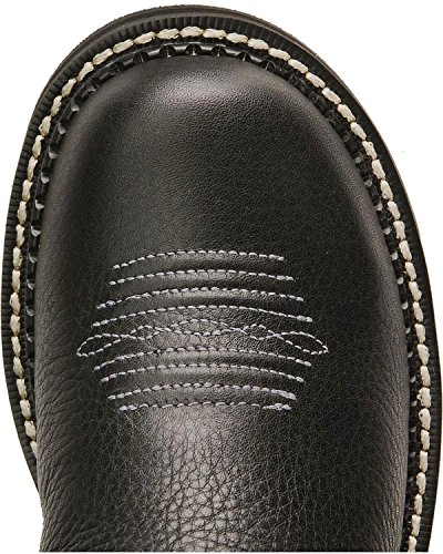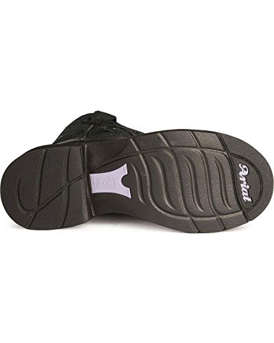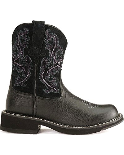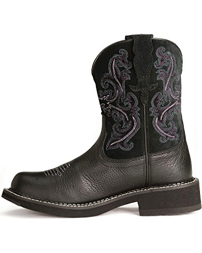 Studio : Ariat Publisher : Ariat Binding : Apparel Product Description Ariat Boot Company ATS technology supports and cushions as you move, promoting good posture and reducing fatigue. At the core of ATS technology is the Ariat ATS composite shank. This patented shank design reduces skeletal and muscular fatigue and injury. Mid-foot support reduces metatarsal stress. The forked shank design allows natural forefoot flex. The ATS footbed has a low-friction surface to protect from heat build-up and blistering. Shock-absorbing gel forefoot cushion reduces skeletal impact stress on knees, hips, and lower back. Cupped footbed chassis offers torsional stability. This Ariat Fatbaby boot takes the "ho-hum" out of your western wardrobe with a standout black and purple pairing of hues Boot features a soft black deertan leather foot under a fancy stitched 8" black suede leather shaft. Fancy suede pull straps. Purple leather lining and taped inside seams. Cushioning, energy-return EVA footbed is removable. Moisture-wicking, anti-bacterial footbed liner wicks sweat away and blocks odor. Single stitched welt. 1 1/2" Duratread heel. Round toe. 0