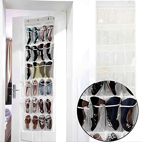 -. Feature : 19" x 64" / set of 2 - each has 24 pockets (tota 48 pockets) / Holds 12 pairs of shoes / Includes over the door hooks / White polypro & clear vinyl