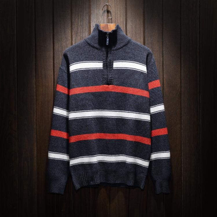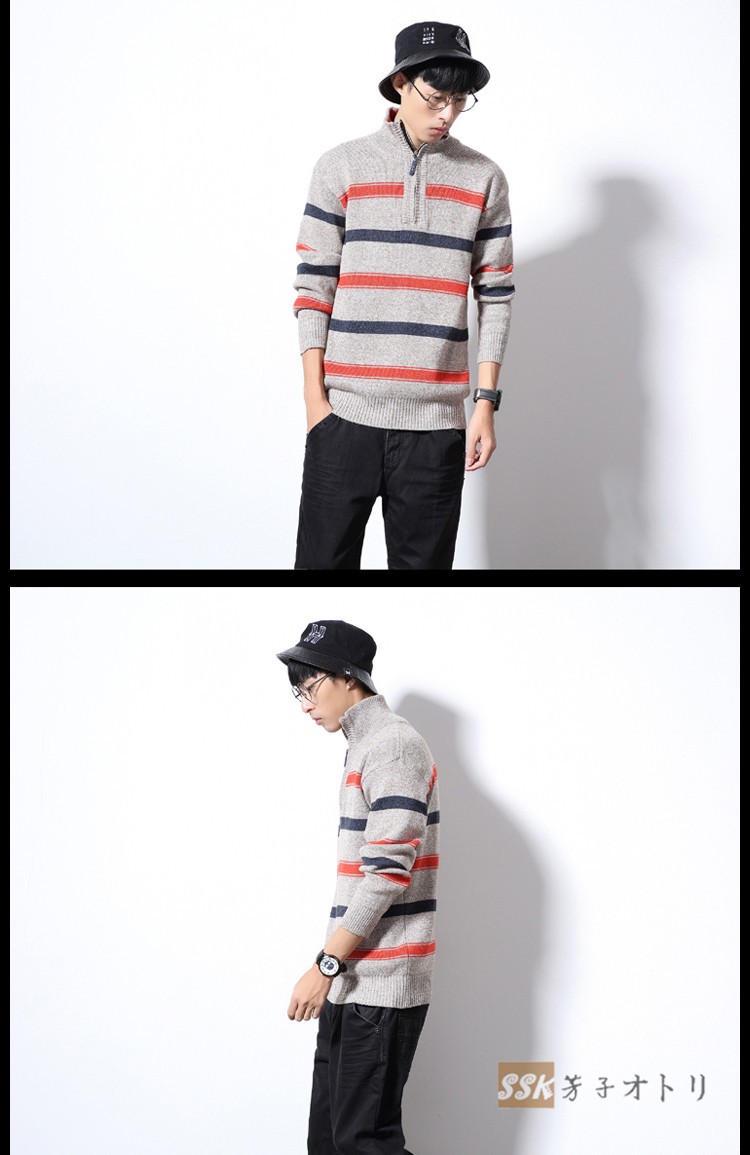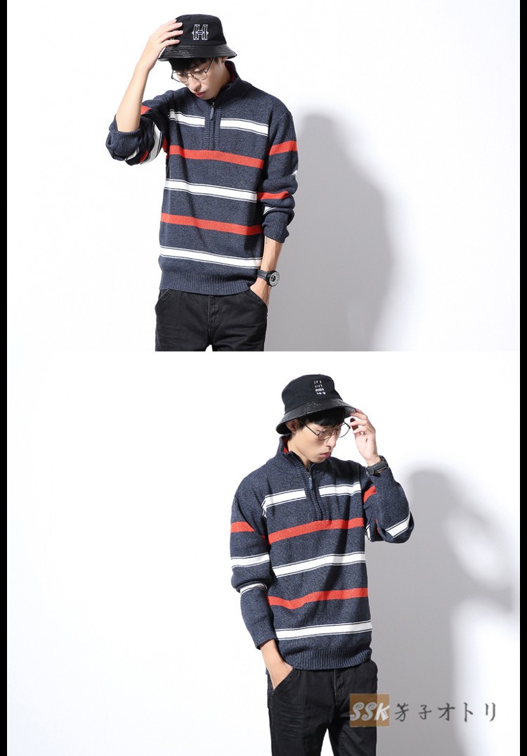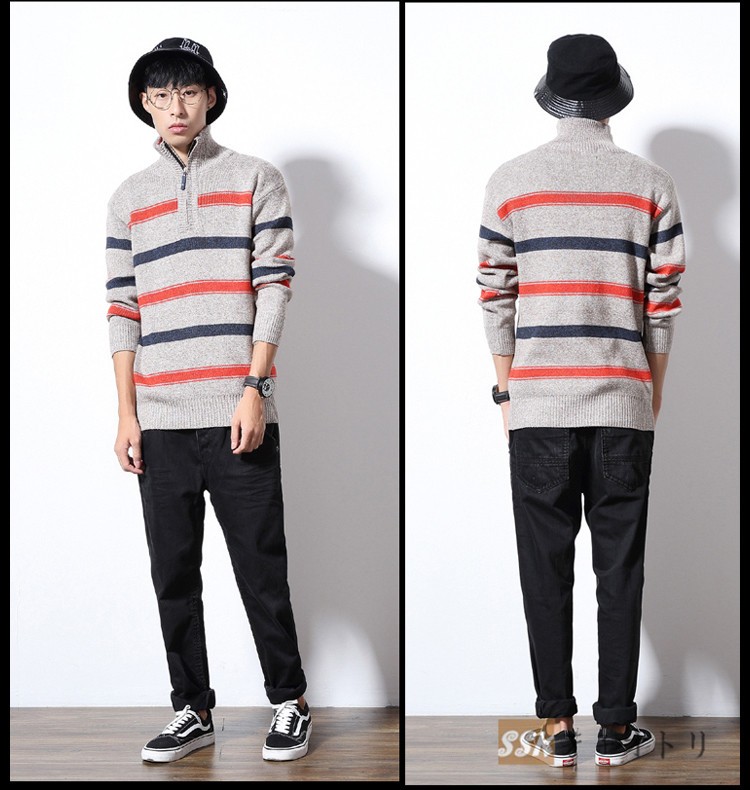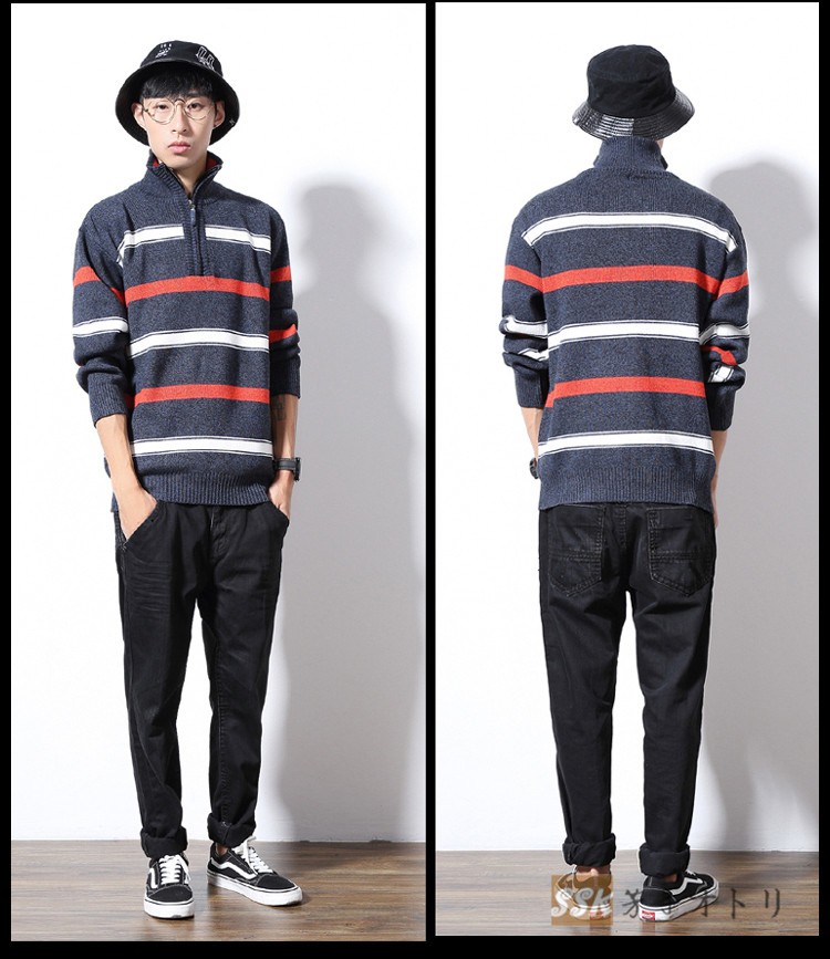 長袖セーター メンズ ニットセーター ハイネック カットソー セーター ニット スリム ルームウェア ストライプ柄 部屋着 秋物