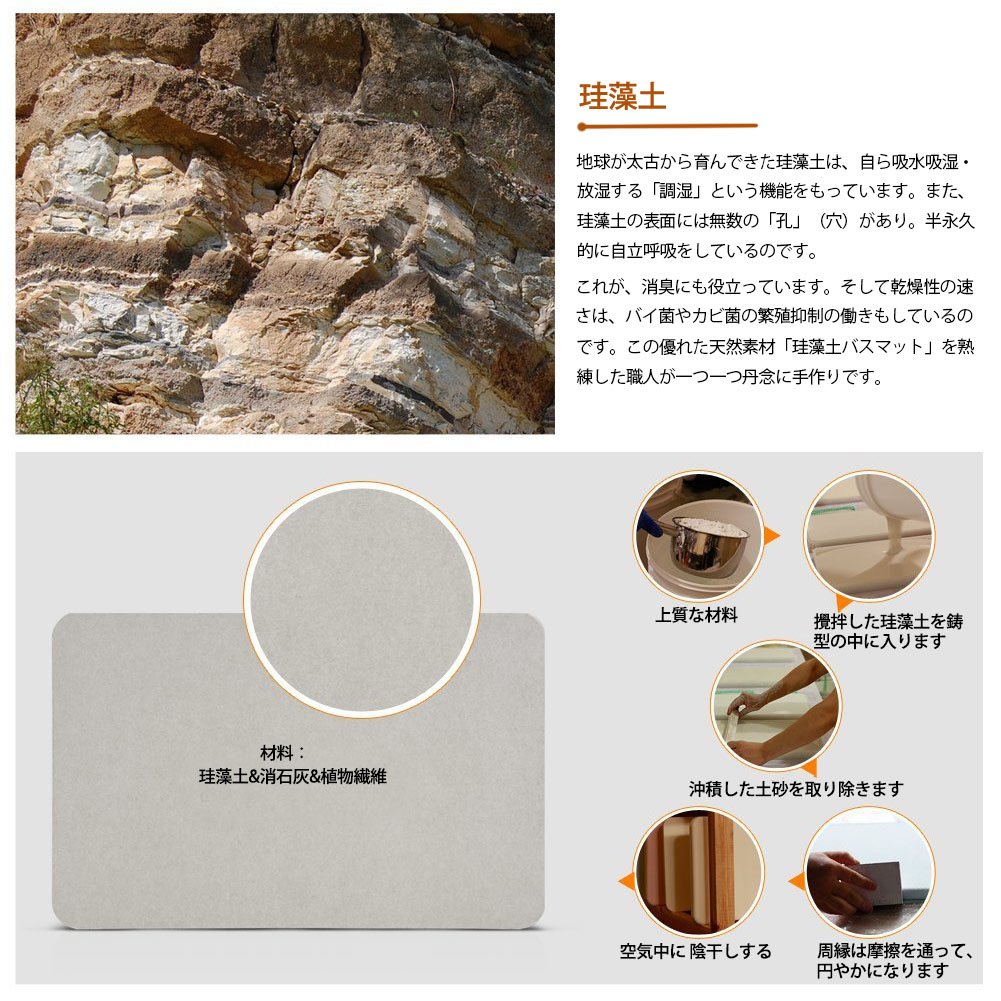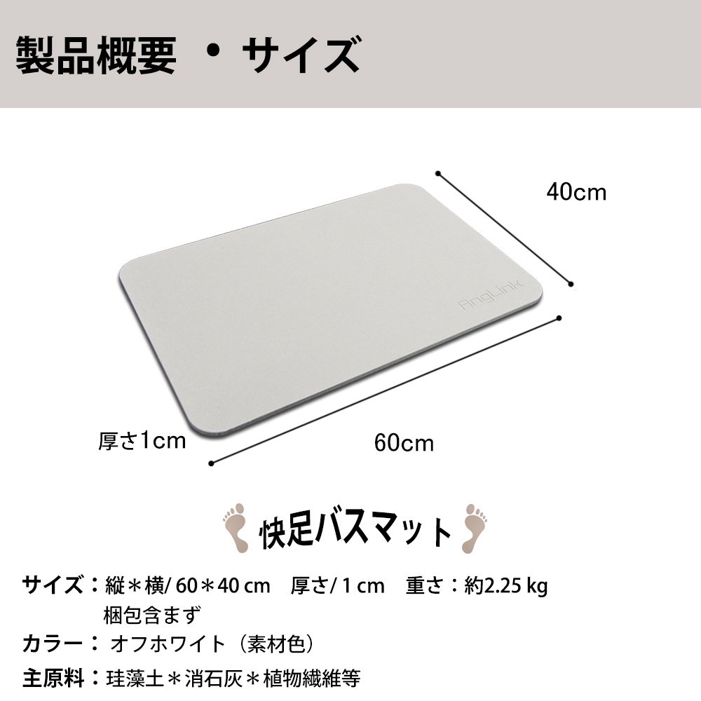 Until now we were using an ordinary cloth bath mat. I am troubled because it is difficult to dry after getting wet with water. It is my first time to use diatomaceous earth mats, but after bathing in the shower, the wet feet are fully absorbed and there is quick drying. We also have slip prevention prepared, I use it with confidence.