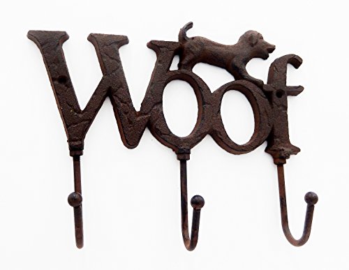 - Dog on "Woof" design solid wall hanger three hookS in brown color vintage or rusty looking - durable to use for hanging key chain, scarf, shirt, necklace and whatever light things you want to hang on it. SCREWS AND DRY WALL ANCHORS ARE INCLUDED.