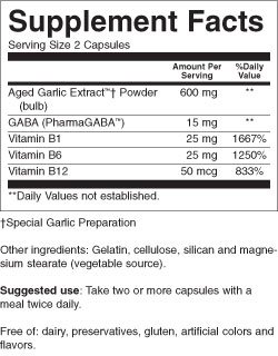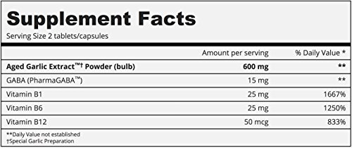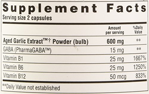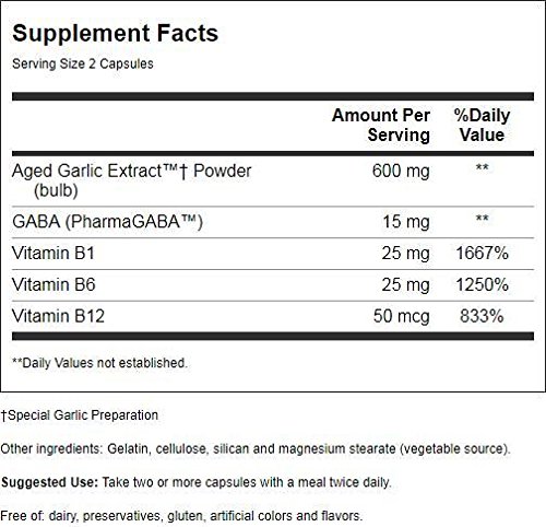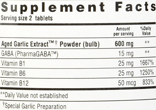 -. Feature : Kyolic aged garlic extract stress and fatigue relief formula 101 / Odorless Organic Garlic Supplement / Unique blend of Aged Garlic Extract, gamma-animobutyric acid (GABA), and vitamins B1, B6 and B12 designed to naturally promote mental, emotional, and physical balance in an increasingly hectic world