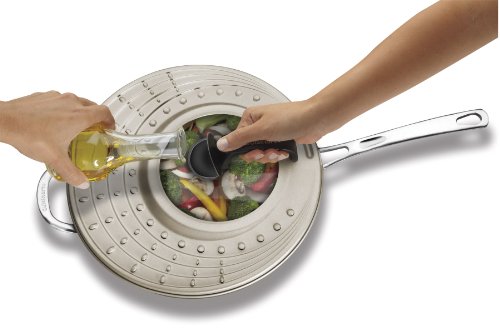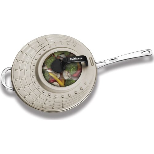 Studio : Cuisinart Publisher : Cuisinart Binding : Kitchen Product Description The Cuisinart Universal Splatter Shield cleans up messes before they start, catching sauces and oils before they end up all over the kitchen. It features a stay-cool handle, nonstick inner coating, and covers both pots and pans. The convenient flip-top funnel lets cooks add liquids during the cooking process, and the tempered-glass viewing window makes it easy to monitor the cooking process without lifting the lid. This one-size-fits-most lid seals in juices, heats, spills, and most of all, flavors. 0