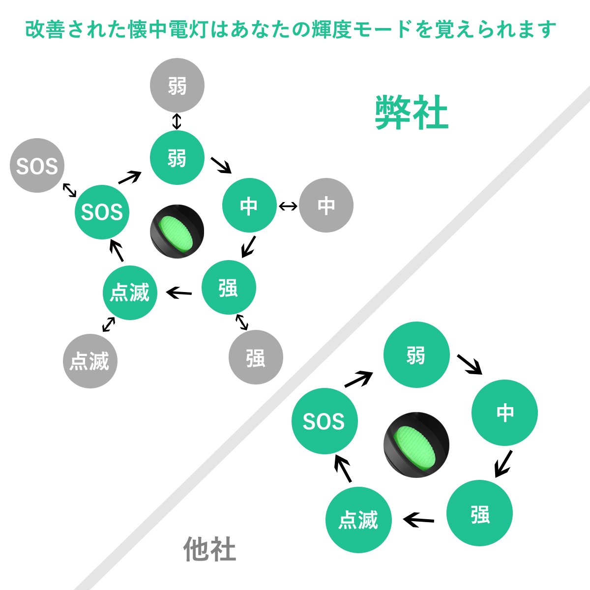 Strong → → Medium → → Weak → → Blink → → Press the SOS switch briefly (halfway) to change the lighting pattern.