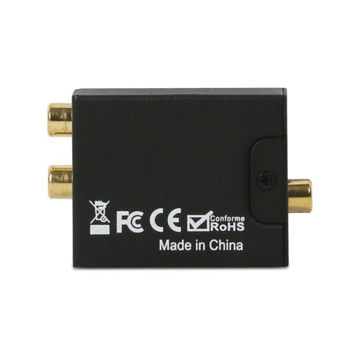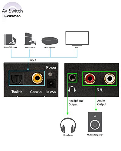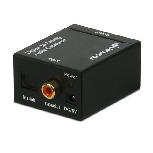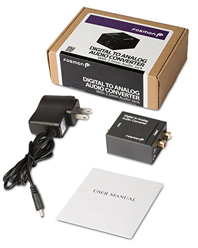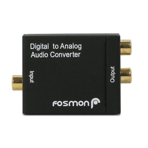 The Fosmon Digital to Analog Audio Converter converts Coaxial or Toslink digital audio signals to analog L/R audio. It allows you to connect to an external device such as an amplifier via standard RCA jacks, or a headphone that uses 3.5mm audio jack.