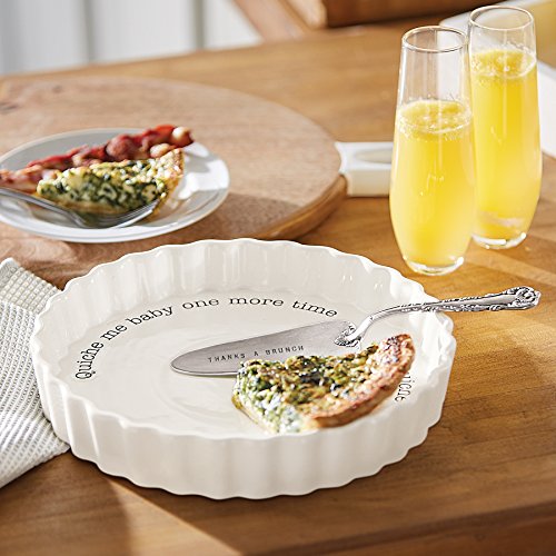 Ceramic quiche dish features ruffle, fluted edge, resist "quiche me baby one more time" sentiment and arrives with vintage-style "thanks a brunch" stamped silverplate server.