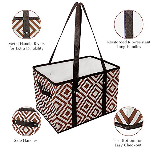 Heavy duty construction - can be folded & Reinforced rip-resistant long handles - flat bottom and handles on the side. Foldable and open top - its easy to load items and hold items inside the shopping box