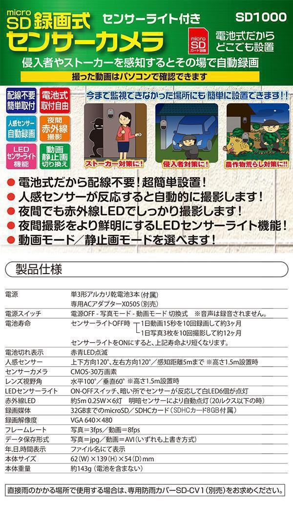 | セット内容 | SD1000本体 マイクロSDHCカード8GB アルカリ乾電池×3 取扱説明書 |