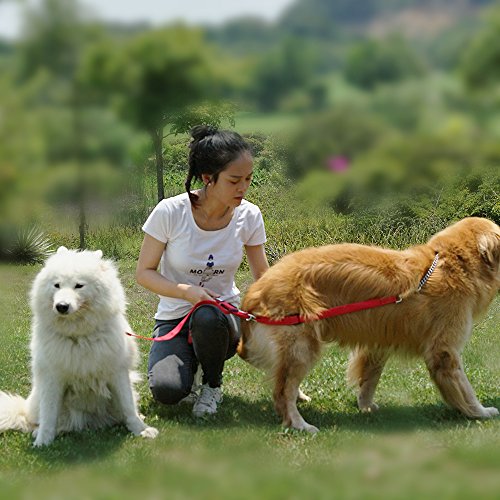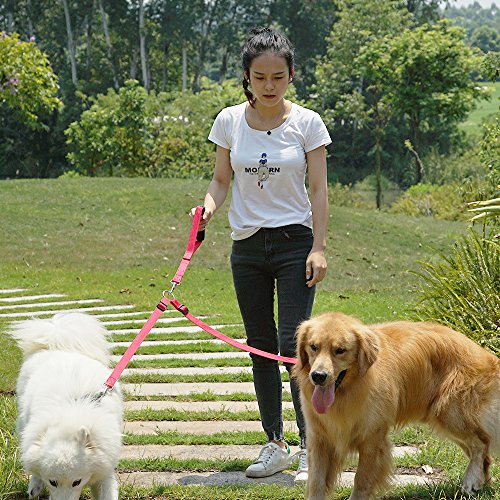 The Dog Leash has two separate adjustable straps. Adjust the length of each part by the black buckle to the perfect size for your needs and then fasten the clips to your dogs' collars or harness (works amazing with a front clip harness).
