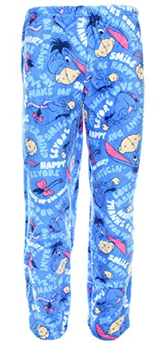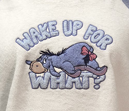 Blue pajama bottoms are an all-over printed pattern with Eeyore, his tail, Wake Up for What, and other familiar Eeyore sayings