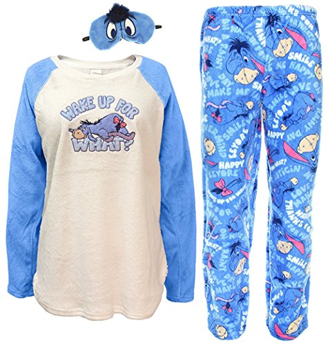 Women's Eeyore long-sleeve top and pants sleepwear set with a Eeyore sleep mask (mask is for fun). Turn inside out, machine wash cold, with similar colors, delicate cycle, do not bleach, tumble dry low, do not iron