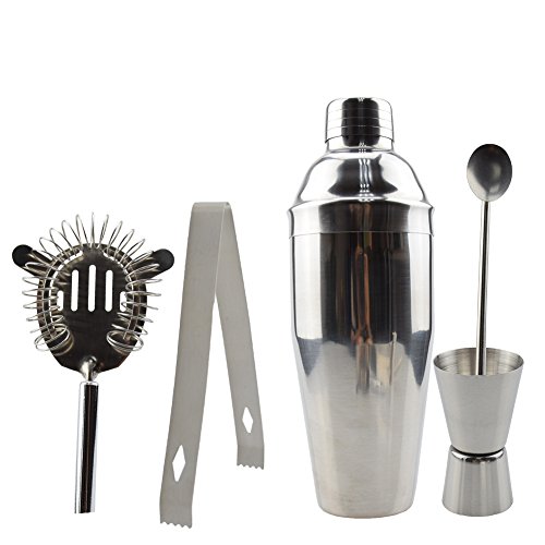 -. Feature : -5 PIECE COCKTAIL SET: 304 Stainless Steel Shaker, measuring jigger, ice strainer, ice clip and ice spoon. / -MATERIAL: 304 superior quality stainless steel. High temperature resistance and solid durable. Corrosion-resistant and high deformation. / - REFINED PROCESSING: all stainless steel solder joints are light treated, beautiful appearance. Easy cleaning keeps it new with long time usage. / - VERSATILE: Absolutely the most useful Barware Equipment for making ice cold cocktail recipes such as Margarita, Cosmopolitan, Long Island Iced Tea or an Apple Martini. / -WORRY-FREE AFTER-SALES SERVICE: If you are not satisfied with the product, please do not hesitate to contact us. Your worries will be eliminated within 24 hours.