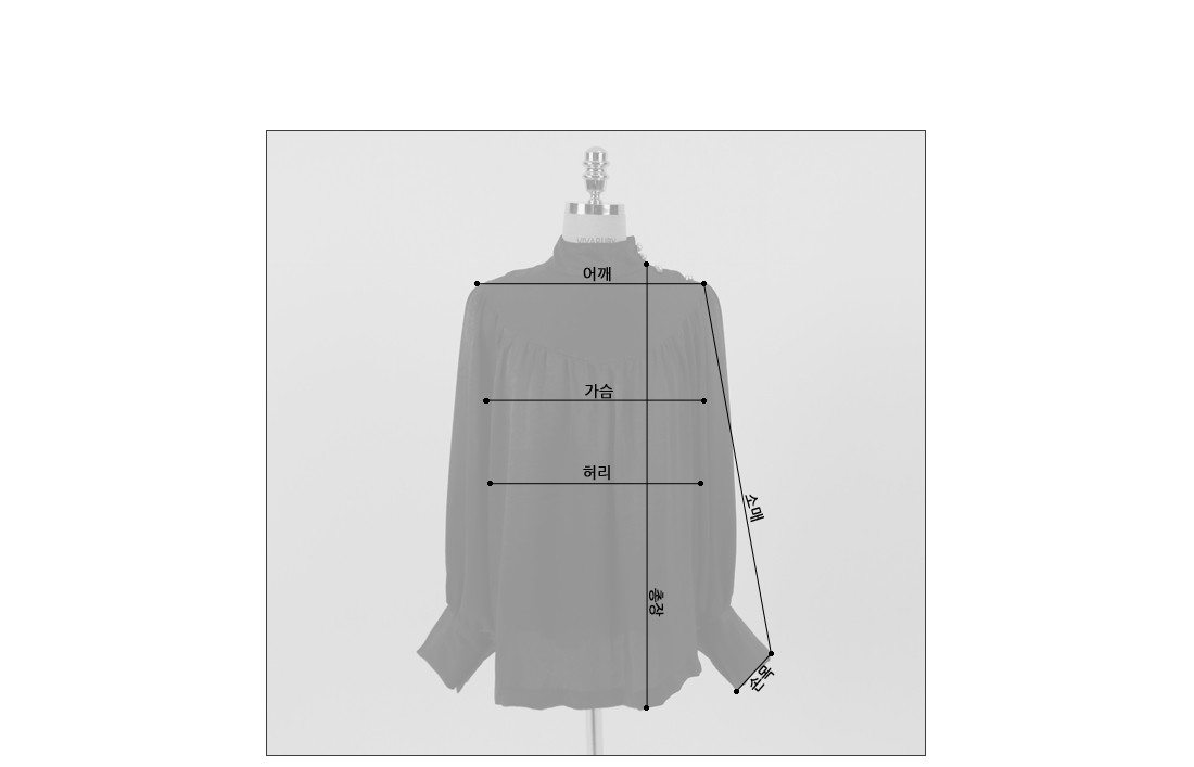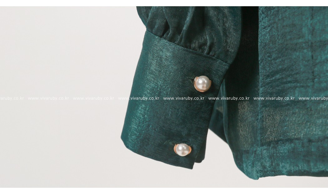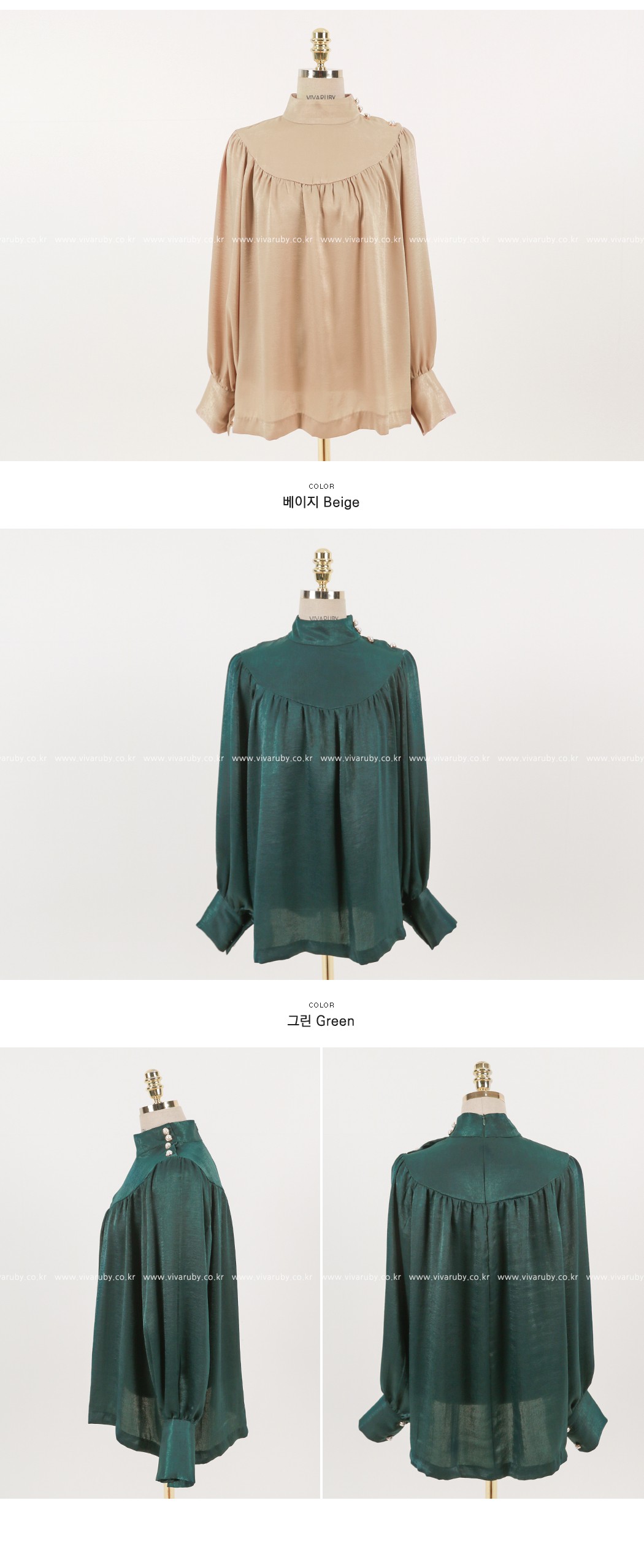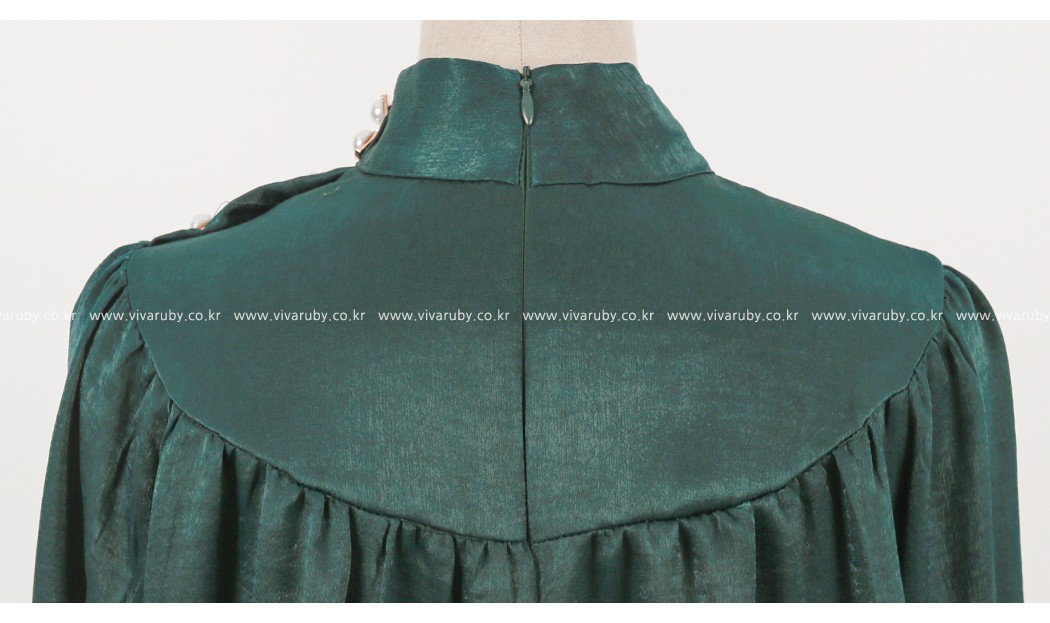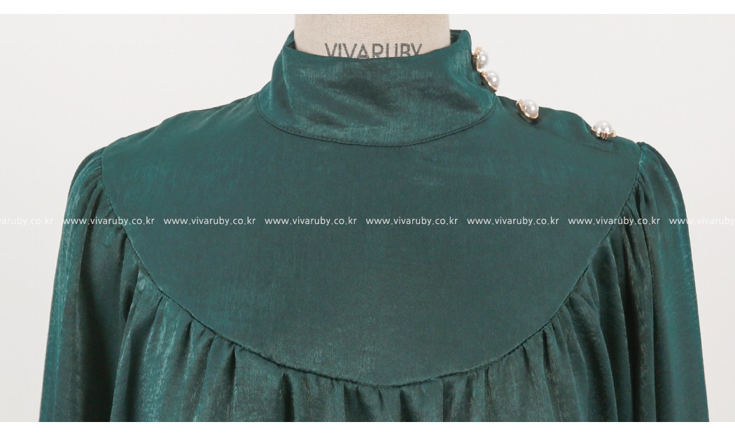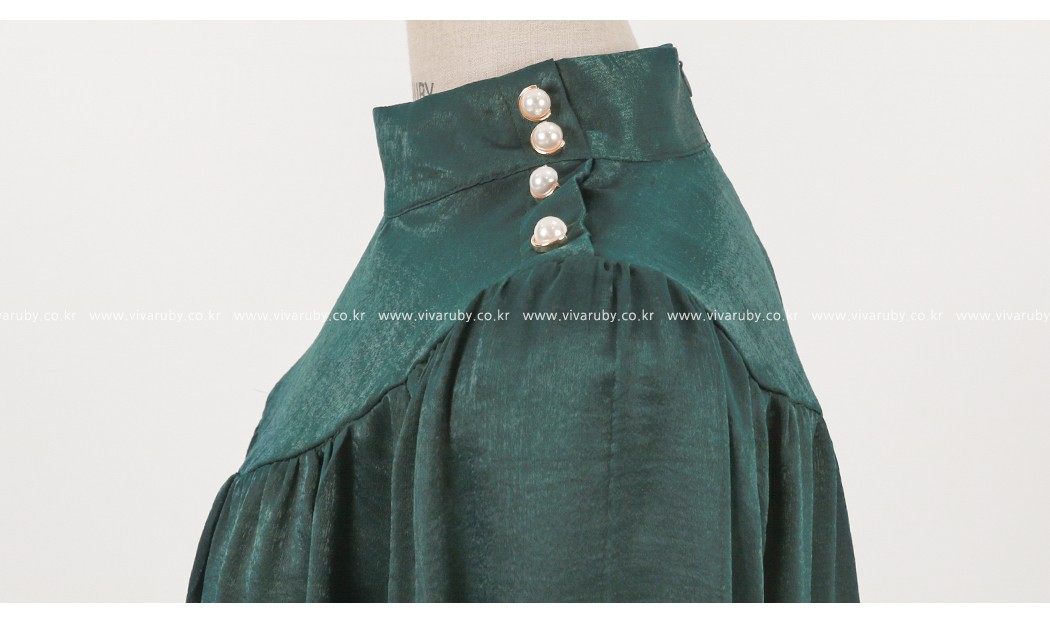 セミハイネックとショルダー・ラインのアンバランスな真珠ボタンが