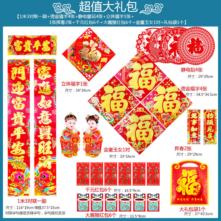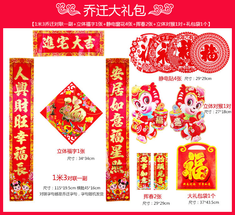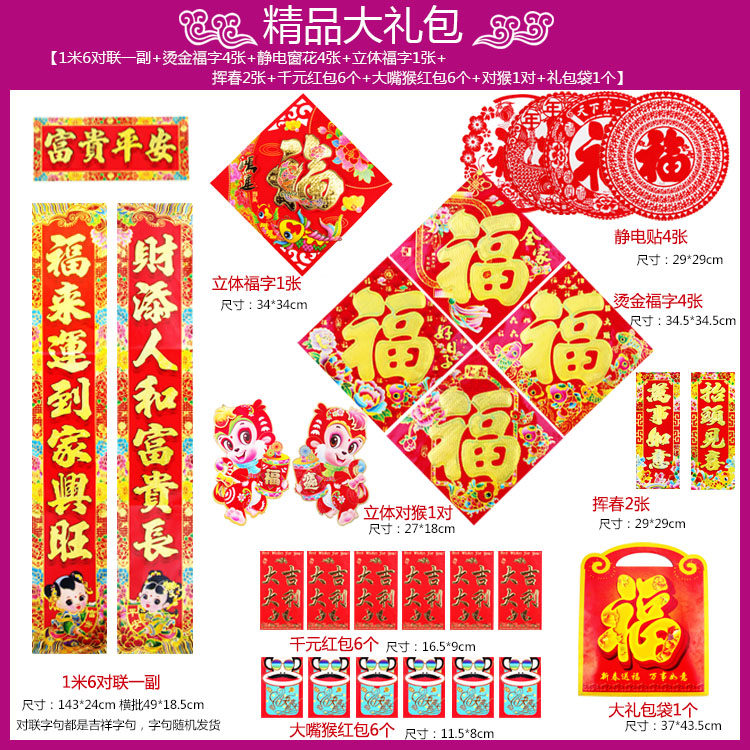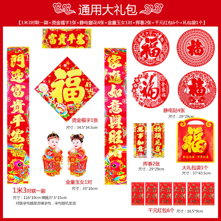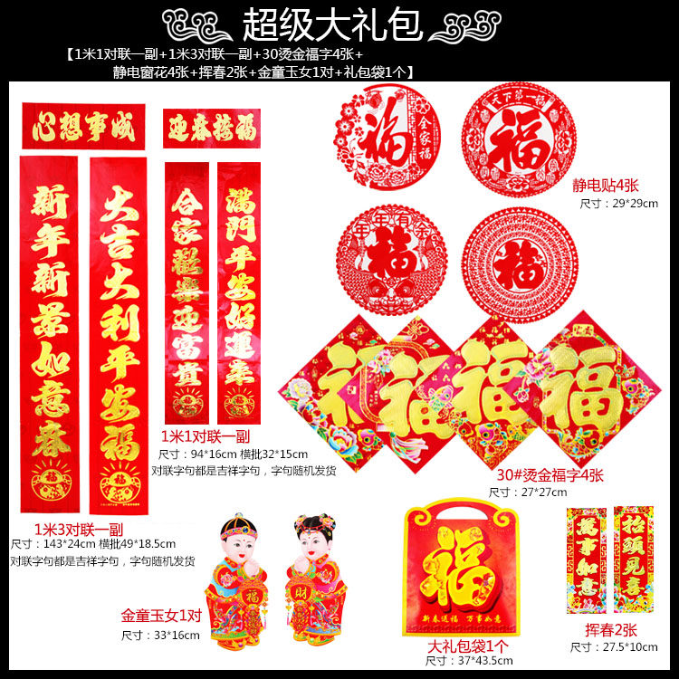 特别注意:每个套餐 所含的对联和福字静电贴数量都不一样,亲要看清楚哦