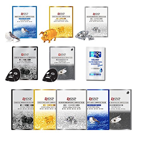 -. Title : SNP(Birds Nest Aqua,Charcoal Mineral Black,Gold Collagen,Diamond Brightening,Black Pearl Renew Black) Ampoule Mask Each 2 Sheets, Total 10Sheets + Hairplus Shampoo 1ea
