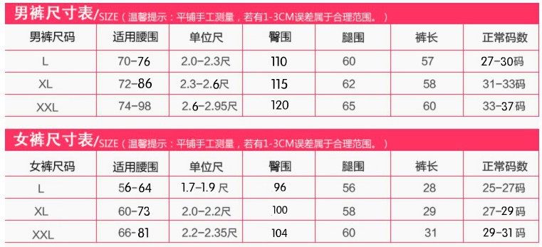 沙滩裤尺寸参考下图