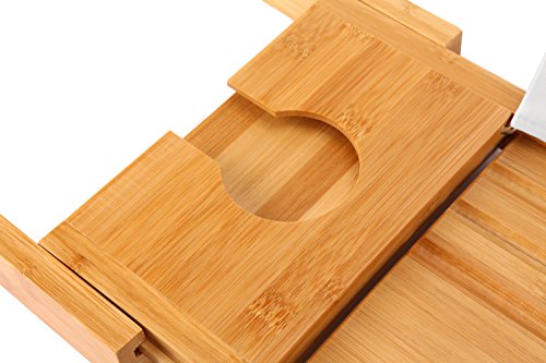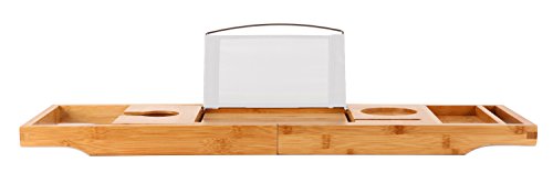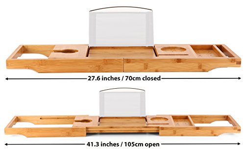 Luxury Bamboo Bathtub Caddy / Tray with Extendable Arms - Includes Book / Tablet Stand, Glass Holder, Phone Compartment, and Rubber Pads to Prevent Slipping - Fits Any Tub Size