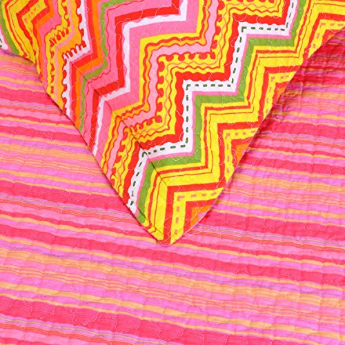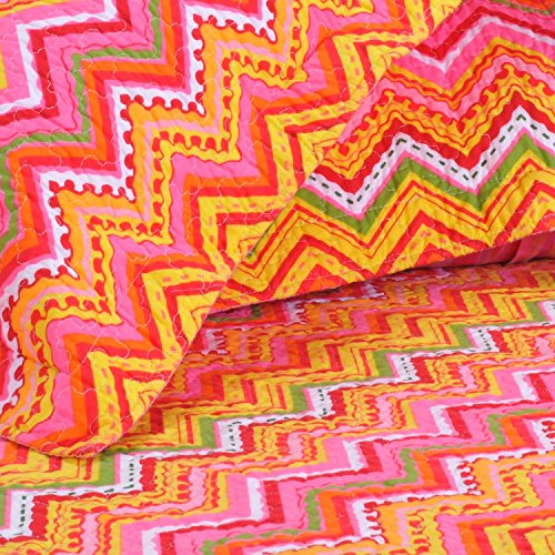 Studio : Overstock Publisher : Overstock Product Description Ideal for use in a teen's room or in a dorm room, this orangezig-zag quilt set adds fun and fashion to any room decor. Vibrantpink and orange tones dominate the color pattern on thiscontemporary quilt set to add personality to your living space. Theedged matching shams help complete the look by tying everythingtogether.Soft Cotton ConstructionEach piece in this zig-zag quilt set is constructed from soft100 percent cotton that's smooth and cool to the touch. The quiltfeatures cotton fill that adds loft and keeps you warm when thenight gets chilly. The attractive quilt's reversible design letsyou change up your decor without breaking your budget by simplyflipping it over when you want a fresh look.Machine Washable for Easy CareFreshen up this quilt set at home by simply tossing it intoyour washing machine for easy cleaning. Durable hemmed seams keepthe padding fully intact in the wash, so you can quickly ridyourself of spills and accidents without worrying about damage orfrayed edges. Set includes: One (1) quilt and Two (2) standard shams Pattern: Zig-zag Style: Patterned Cover materials: 100% cotton Fill materials: 100% cotton Backing materials: 100% cotton Care instructions: Machine washable Full/Queen Dimensions: Quilt: 88 inches wide x 92 inches long Shams: 20 inches wide x 26 inches longThe digital images we display have the most accurate colorpossible. However, due to differences in computer monitors, wecannot be responsible for variations in color between the actualproduct and your screen. 0