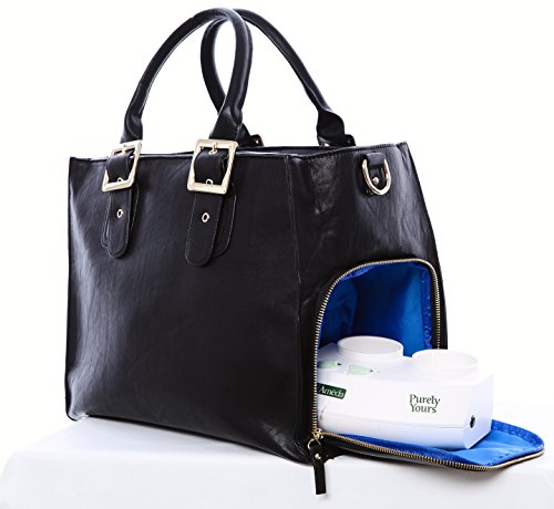 - Feature : Stylish and discreet alternative to standard breast pump bags, can be used again as a purse or diaper bag! / Pump pocket size: 6.25" x 6.5" x 6.5" (fits most brands of double electric pumps) / Exterior side pocket for breast pump on one side and insulated storage on the other; plus interior pockets to hold cell phone, keys and essentials / Made from vegan leatherette - wipeable and spill resistant / Includes removable, adjustable strap; 2 reusable ice packs and washable dirty bottle bag