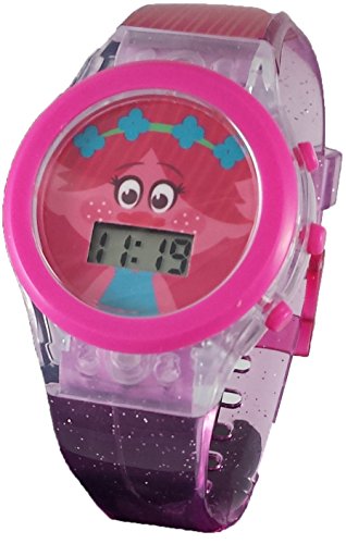 -. Binding : Watch -. Brand : Trolls -. Department : girls -. EAN : 0030506439240 -. Feature : With the press of the corner button the watch will light up for 10 seconds / Soft silicone band adjusts to the size of your child's wrist with 9 holes and a buckle clasp / Glitter in the clear soft pink band -. Label : accutime -. Manufacturer : accutime -. Model : TRO4005 -. MPN : TRO4005 -. PackageQuantity : 1 -. PartNumber : TRO4005 -. ProductGroup : Watch -. ProductTypeName : WATCH -. Publisher : accutime -. Studio : accutime -. Title : Trolls Girl's Poppy Pink Digital Light Up Watch -. UPC : 030506439240