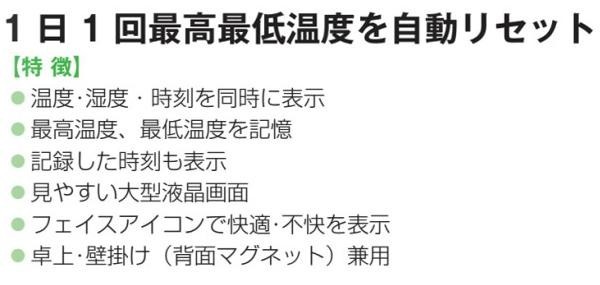 | 仕様 | 置・掛兼用(背面マグネット付) 使用電源:単4形電池1個 【使用範囲】 温度:0~50度、湿度:20~90%RH 【精度】 温度:±1度(0~40度)、±2度(左記以外) 湿度:±5%(40~70%RH・常温)、±7%RH(左記以外) |