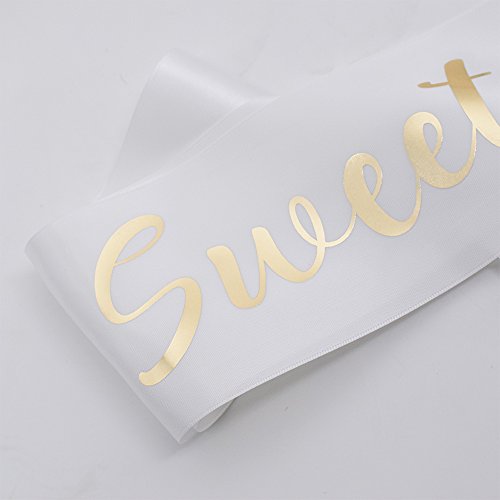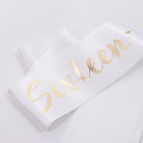 FCAROLYN “Sweet Sixteen” 16th Birthday Sash - White Satin Sash with Gold Lettering - 16th Birthday Party Supplies