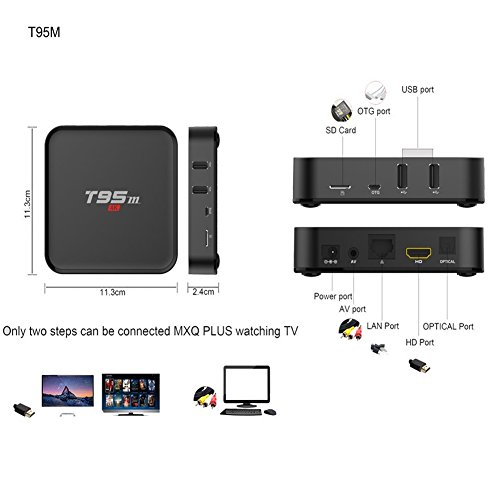 -. Feature : T95M is a smart Streaming Media Player with Android 6.0 OS,Amlogic S905X Quad-Core Cortex-A53 Chipset,Mali-450 5-Core GPU,up to 2.0GHz, easer access to watch TV, enjoy media effortlessly over the internet, smoothly watch video and surf the Web quickly. can be perfectly compatible with majority of Android APP. / 2GB DDR3 and 8GB EMMC flash. 64 Bit:Amligic S905X solution, the MOST professtional Quad core CPU performance for Network TV Box. Full Quad core,2GHz Ultra high frequency,more than 4 times performance improvements. support WIFI:2.4GHz. / Comes with video output UHD 4k*2k H.265 60fps HW decoding and 3D, you can enjoy 4K and 3D video smoothly and clearly. Also built in WIFI and LAN, HDMI port, supports keyboard/mouse via USB or wireless. / Support 4K Ultimate HD vedio hardware decoding. With preinstalled Google Play Store and other apps, you can enjoy smooth multi- tasking, game playing or movie viewing. / The appearance of high-grade acrylic, large vents, long runs, fast and stable,2 USB interfaces to meet the needs of different users.Support HDMI / AV OUT variety of video output, support WIFI b / g / n 802.1.1,4K RJ45, and other online mode, to meet different customer needs of different TV.