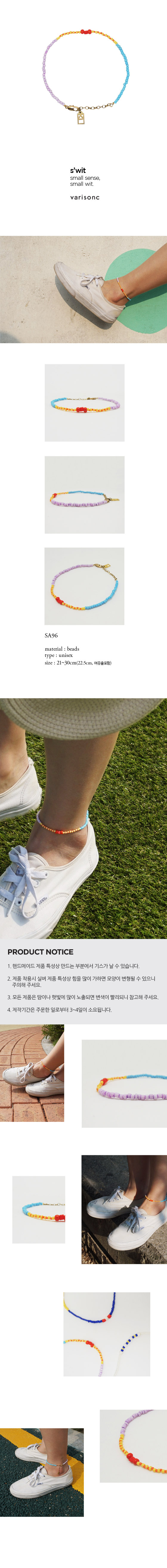 - 주문시 유의사항 : ** 유의사항 ** [사이즈 안내] 자신의 발목 둘레 정사이즈를 옵션에서 선택해주세요 옵션 선택 : 21~30cm (여유줄 4cm로 길이조절가능) 하늘, 노랑, 오렌지, 연보라 컬러의 비즈로 디자인한 발찌입니다. 발목을 더 돋보이게 할 포인트 아이템입니다.