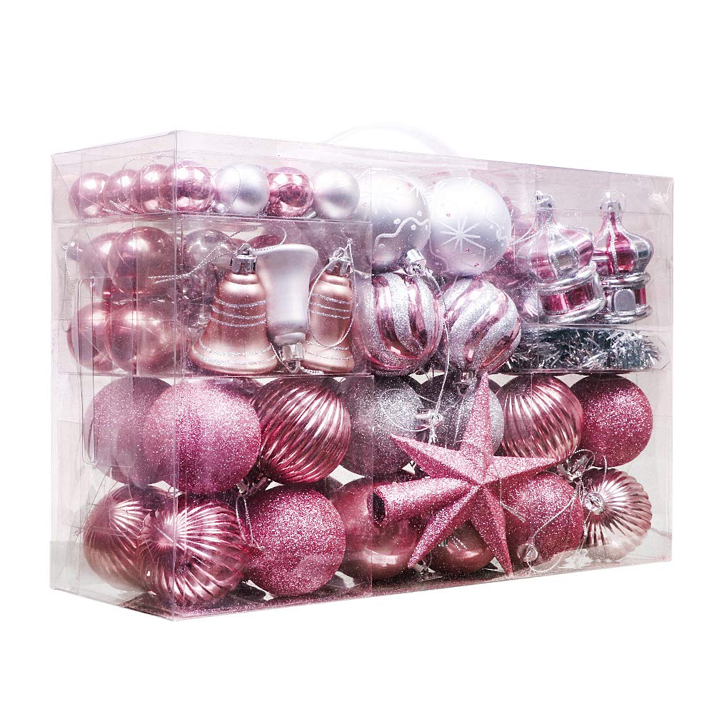 2018年新登場!!エレガントなシルバーとミステリアスで甘いピンクを融合としたピンク系のオーナメントはロマンティックなクリスマスを見事に演出します。 サイズ豪華な100個セット・16種類大集合!!これだけの高級オーナメントを単品で購入すれば、あれこれ悩む必要もなく、お手持ちのツリーを華やかになります。 イルミネーションと一緒に飾ればキラキラと美しく反射して、クリスマスの雰囲気が抜群。 おしゃれなシルバーとピンクをベースしたボールは、ロマンティックなクリスマスを演出します。 アクセサリーはすべてひもをつけて,とても便利につるすことができる.包装も頑丈なデザインを工夫しましたので、ご安心ください。ただ一つの単品でツリーを360度全面的に飾りたいお客様におすすめです。