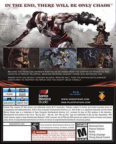 -. Feature : NOW ON THE PS4 SYSTEM - Gameplay is beautifully rendered at 1080p and running at 60fps, God of War III Remastered is ready for the next generation. All previous DLC costumes and content are included. / PHOTO MODE - God of War III Remastered's photo mode will allow players to freeze, edit, and share photos of all of Kratos' jaw dropping action. / GROUNDBREAKING DEPTH OF SCALE - From the glittering marble of halls of Mt Olympus to the desolate deserts of Tartarus, Kratos will explore worlds both epic and majestic. / STYLIZED REALISM - Players will battle in detailed and unique 3D worlds lit by thousands of dynamic lights and textures with quadruple the resolution, now refreshed in stunning detail. / SIGNATURE GAMEPLAY - Brutal combat, intricate puzzles, exploration of awe-inspiring worlds, and a compelling and satisfying ending to Kratos' epic story.