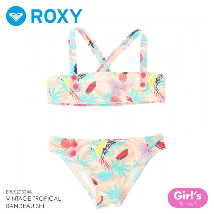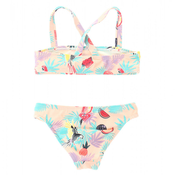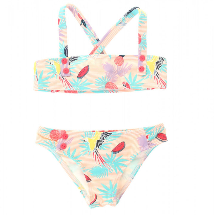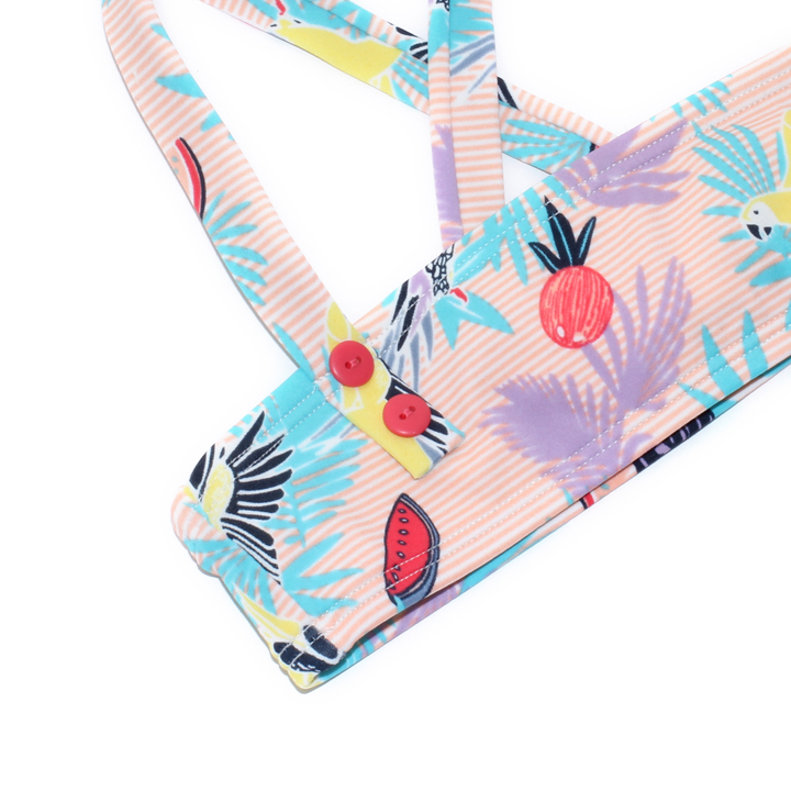 ボタニカル柄とフルーツ柄がポップで可愛いビキニです。ビビッドなオウムもアクティブな印象に。二つずつ並んだポイント使いの赤ボタンで調節も可能。ブランドロゴアイコンの刺繍が施されたバックスタイルがキュートなポイントです。