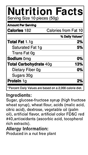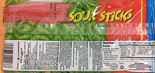 -. Feature : Product Of Holland. Pack Of 3. / Delicious strawberry flavored sour sticks Artificially Flavored Candy Sticks. / Serving Size 10 Pieces (50g) Serving Per Package 2. / Produced In A Nut Free Plant. / Ingredients: Sugar, Glucose-Fructose Syrup (High Fructose Wheat Syrup), Wheat Flour, Acids (Malic Acid, Citric Acid), Dextrose, Vegetable Oil (Palm Oil), Artificial Flavor, Artificial Color (E129) (Also Named, Allura Red Ac Or FD&C Red 40), Antioxidant (Ascorbic Acid, Tocopherol Rich Extracts). (E 129 May Have An adverse Effect On Activity And Attention In Children.