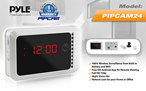 The PIPCAM24 Covert Clock IP Camera is perfect for anyone looking for an adaptable solution for indoor home monitoring. An internal battery opens up a whole world of options allowing you to quickly move the camera between locations within range of your WIFI router. Our newly designed Pyle IP Pro app makes it easier than ever for anyone to setup and get off the ground running with new connection options and built in support and FAQ walk throughs. PIPCAM24 features AP setup allowing our most convenient setup option yet, no wire needed to pair up with your router! Plug in an SD card (32G max) and set the camera to record in 24hr or motion detection mode. Check your SD recordings from your desktop OR the Pyle IP Pro app. 100% Secure: protect your privacy by setting a unique password to access the camera. Get clear shots even at night with the light activated NIGHT VISION LEDs. A built in SPEAKER and MICROPHONE allows you to listen or speak through the camera remotely. The camera can be used on WINDOWS or MAC PCs that you own, or viewed remotely from a web browser of a desktop that you do not. Pair 2 cameras with iVideon (3rd party service) for free and take advantage of cloud recording and monitoring. Share your unique and secure camera code with friends and family and let them check in on things. Great for keeping an eye on pets, kids and your home security! Package includes PIPCAM24, Suction Cup Mount, Ethernet Cable (for wired data connection), AC power adapter, Software Disk. 1 year Manufacturer’s warranty by Pyle!Feature