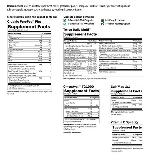 COMPREHENSIVE PACKAGE - Each kit contains - 30 - Single serving Organic PurePea Plus drink mix packets, 30 - Capsule packets containing - 2- Twice Daily Multi capsules, 1- OmegAvail TG1000 soft gel, 2- Cal/Mag 1:1 capsules, and 1- Vitamin D Synergy capsule. The kit also contains a program guidebook. *
