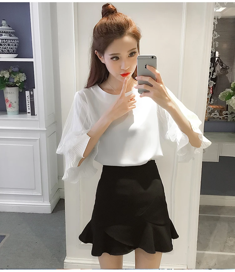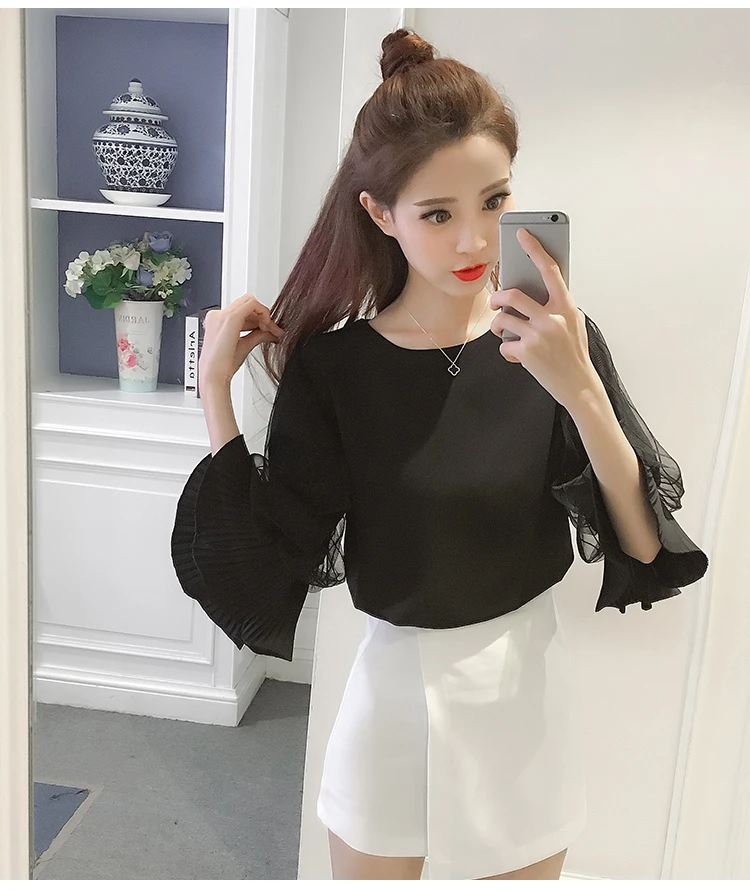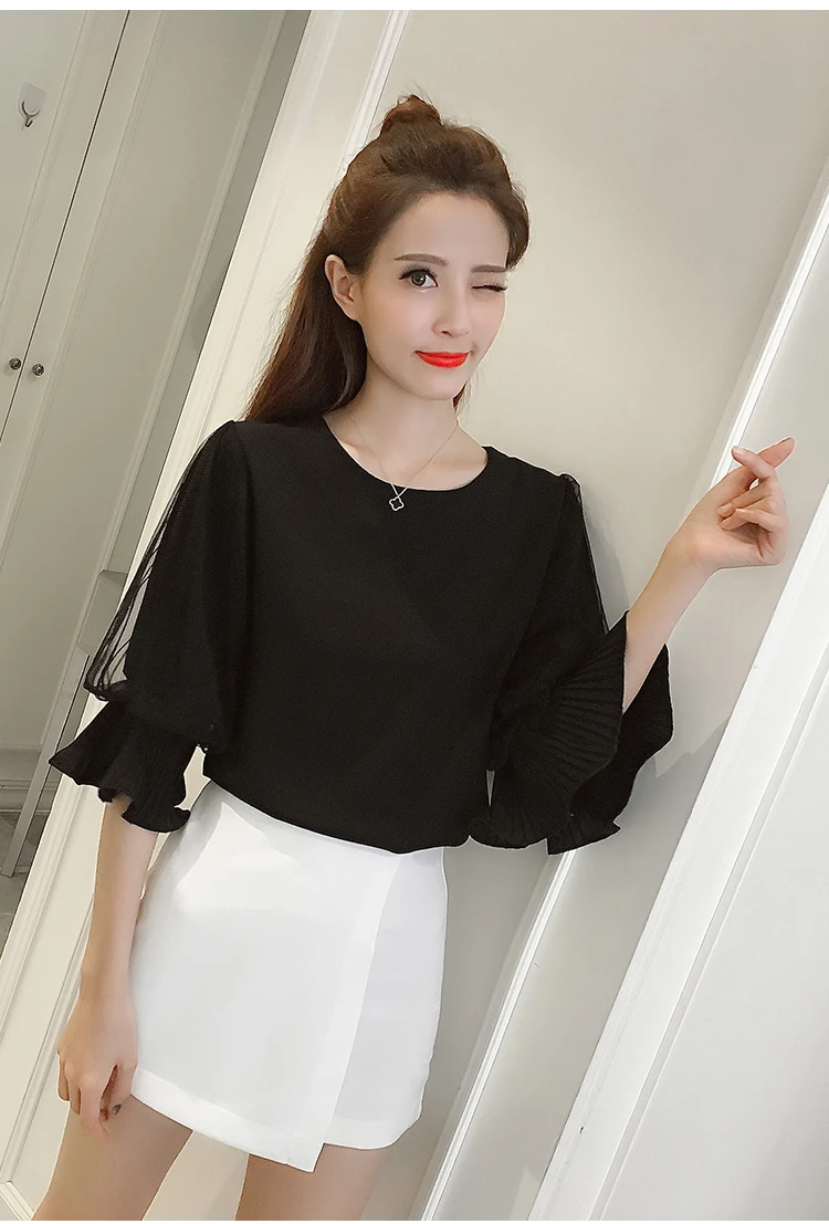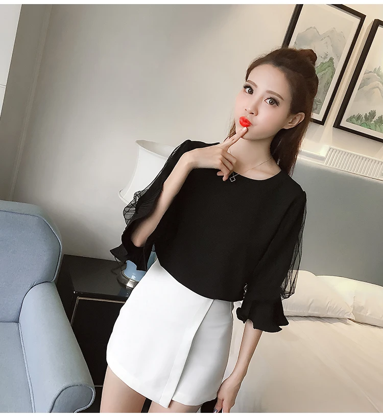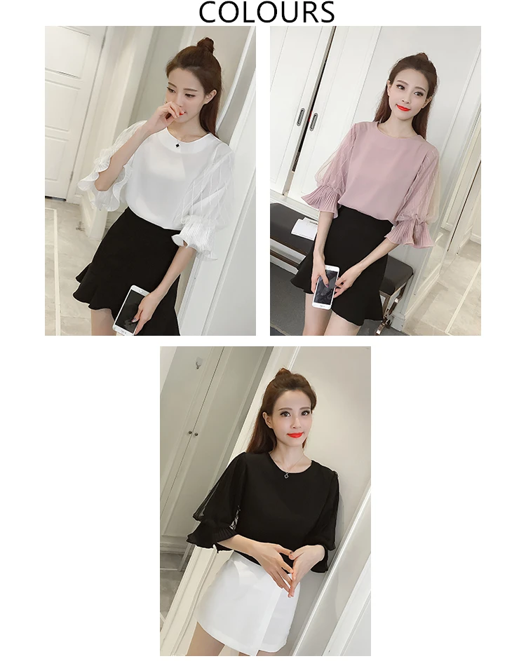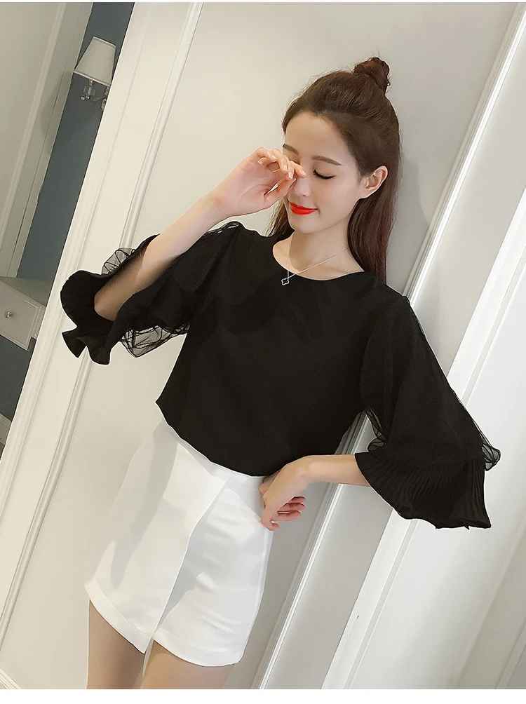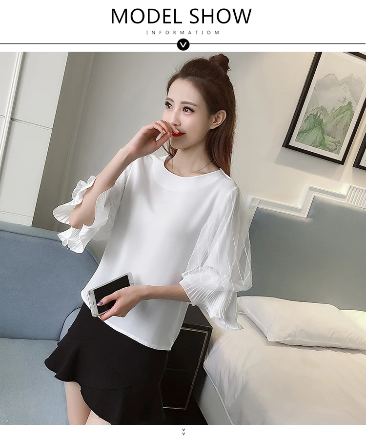 Women Tops Detail Design:Half Flare Sleeve Women Shirt Chiffon Ruffled Flare Sleeve Chiffon Top