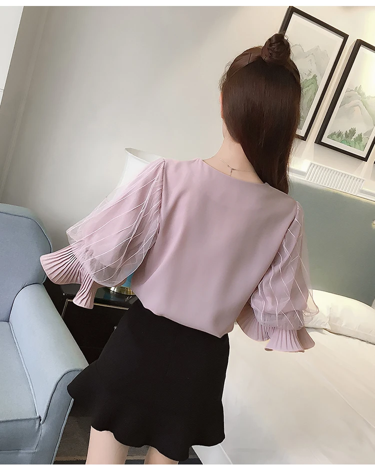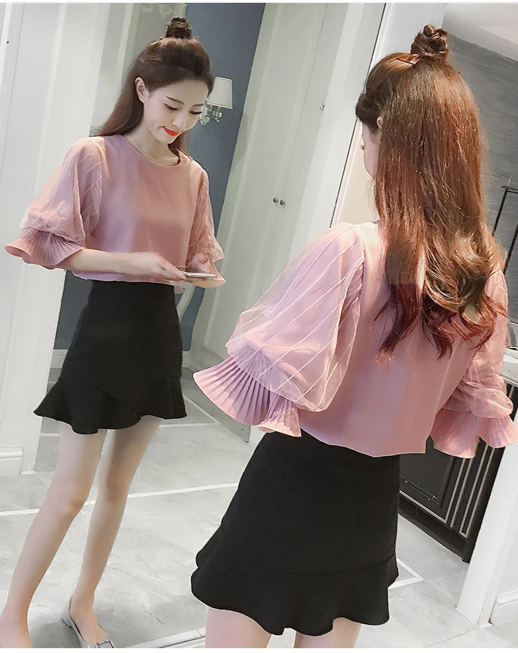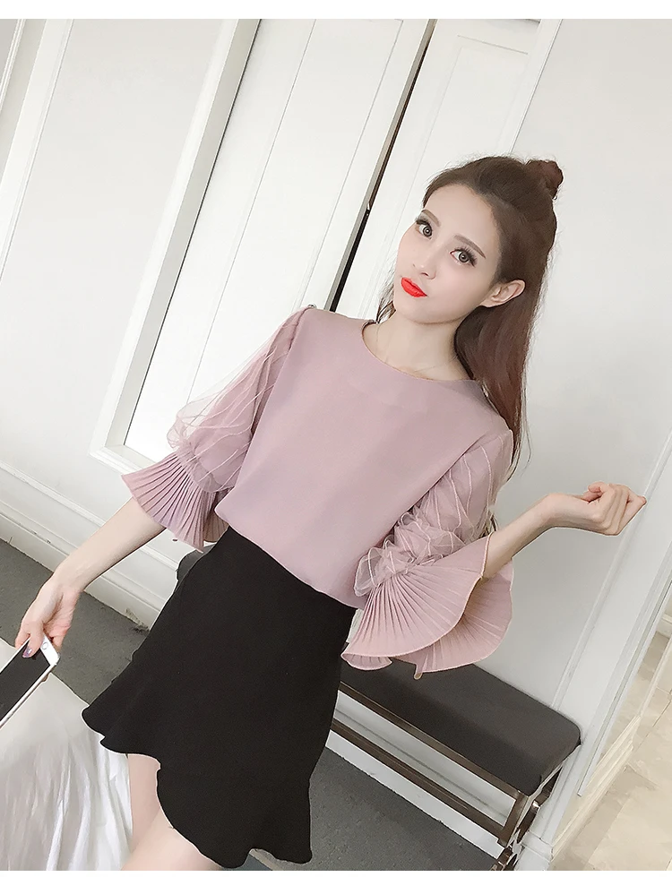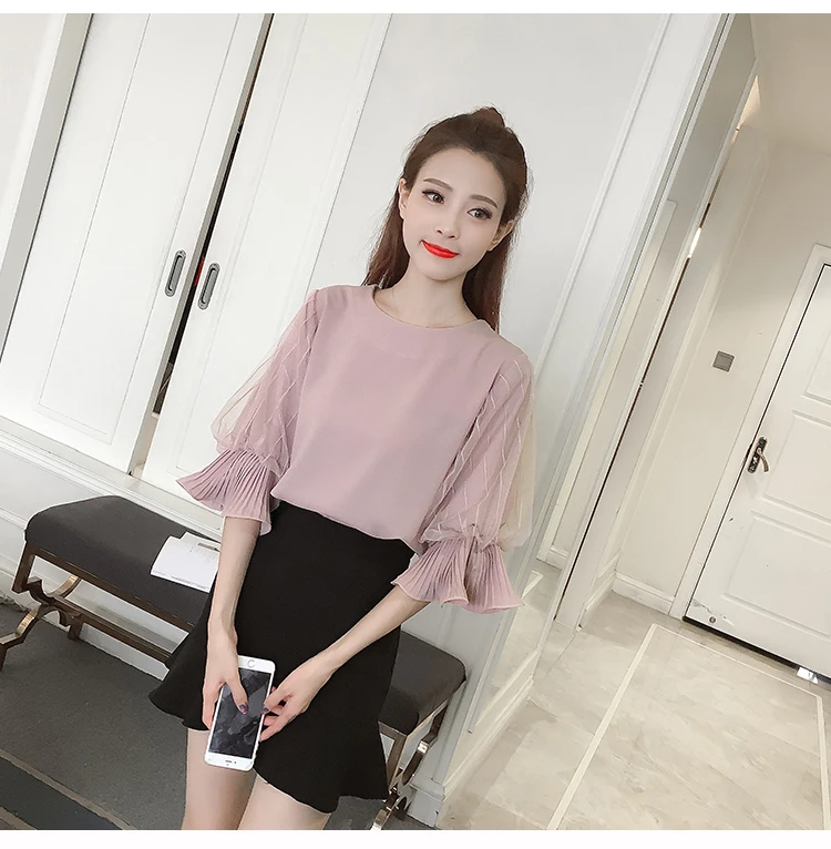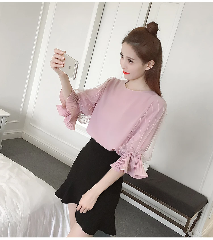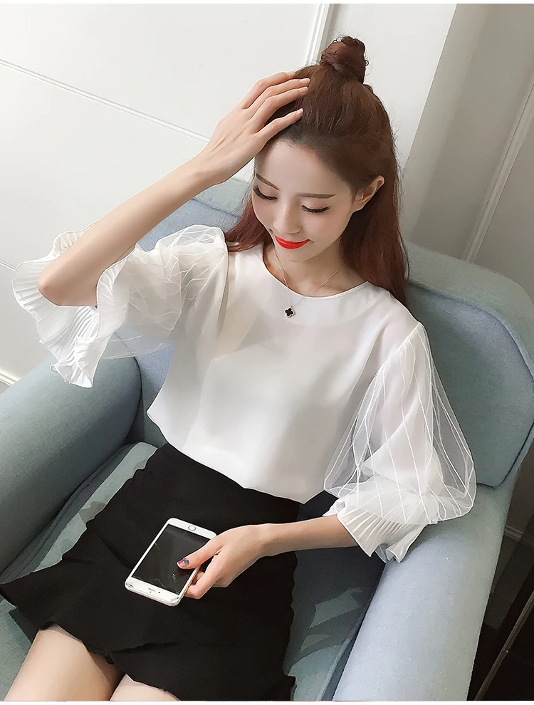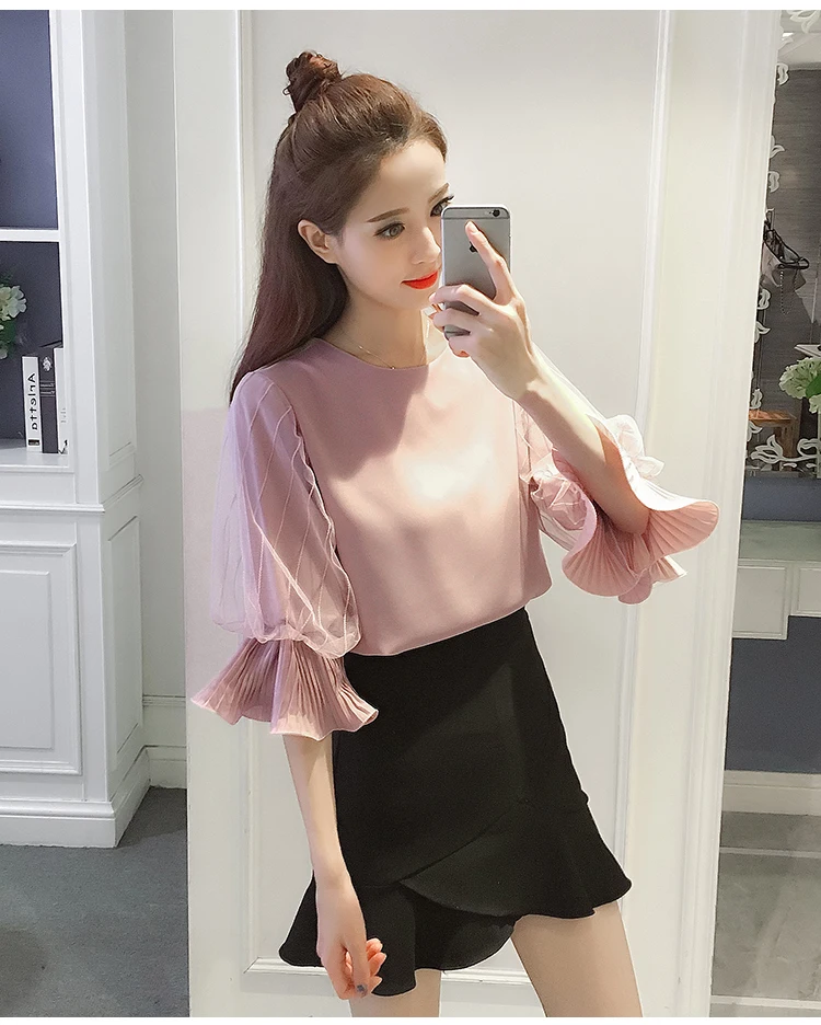 Women Tops Detail Design:Half Flare Sleeve Women Shirt Chiffon Ruffled Flare Sleeve Chiffon Top