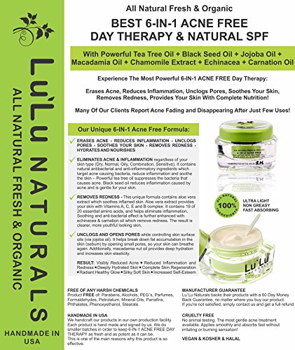 -. Binding : Misc. -. Brand : Lu'Lu Naturals -. Feature : IT ELIMINATES ACNE & INFLAMMATION regardless of your skin type (Dry, Normal, Oily, Combination, Sensitive). It contains natural antibacterial and anti-inflammatory ingredients which target acne causing bacteria, reduce inflammation and soothe the skin - Powerful tea tree oil suppresses the acne causing bacteria P. acnes. Black seed oil reduces inflammation caused by acne and is gentle for your skin. / REMOVES REDNESS - This unique formula contains aloe vera extract which soothes inflamed skin. Aloe vera extract provides your skin with Vitamins A, C, E and B complex. It contains 19 of 20 essential amino acids, and helps eliminate inflammation. Soothing and anti-bacterial effect is further enhanced with echinacea & carnation oil which remove redness. The result is a clearer, more youthful looking skin. / JOJOBA OIL UNCLOGS AND OPENS PORES while controlling skin surface oils. It helps break down fat accumulation in the skin (sebum) by opening small pores, so your skin can breathe again. Additionally, macadamia nut oil provides deep hydration and increases skin elasticity. / FREE OF ANY HARSH CHEMICALS. ALL NATURAL FRESH & ORGANIC Product FREE of: Parabens, Alcohols, PEG`s, Parfumes, Formaldehydes, Petrolatum, Mineral Oils, Parrafins, Phthalates, Phenoxyethanol, Stearate. No animal testing. The most gentle acne treatment available. Applies smoothly and absorbs fast without irritating or burning sensation! / MANUFACTURER GUARANTEE & HANDMADE IN USA - Lu`Lu Naturals backs their products with a 60 Day Money Back Guarantee, no matter where you buy our product. If you're not satisfied, simply contact us and get a full refund. We handcraft our products in our own production facility. Each product is hand made and signed by us. We do smaller batches in order to keep our 6-IN-1 ACNE FREE Day Lotion as fresh and as potent as it can be. This is one of main reasons why this product is so effective. -. HazardousMaterialType : Unknown -. Label : Lu'Lu Naturals -. Manufacturer : Lu'Lu Naturals -. Model : AFD-01 -. MPN : AFD-01 -. NumberOfItems : 1 -. PackageQuantity : 1 -. PartNumber : AFD-01 -. ProductGroup : Beauty -. ProductTypeName : BEAUTY -. Publisher : Lu'Lu Naturals -. Studio : Lu'Lu Naturals -. Title : Best All Natural & Organic 6-IN-1 ACNE FREE Acne Treatment Eliminates Acne & Inflammation - Removes Skin Redness - Unclogs and Open Pores Regardless Of Your Skin Type (Dry, Normal, Oily, Combination, Sensitive). Formula With Tea Tree Oil + Black Seed Oil + Carnation Oil + Echinacea + Aloe Vera & Natural SPF Leaves Skin Acne Free With More Radiant & Youthful Glow. This Organic Acne Treatment Is Great Day Moisturizer With SPF - Increases Skin Elasticity & Jumpstarts Acne Scar Removal Process. This Acne Spot Treatment Works And Will Provide You With Results You Were Looking For - 100% Guaranteed! Handmade in USA. Vegan, Kosher & Halal. Cruelty FREE. Ultra Light - Non Greasy - Fast Absorbing - Paraben FREE! Alcohol FREE!