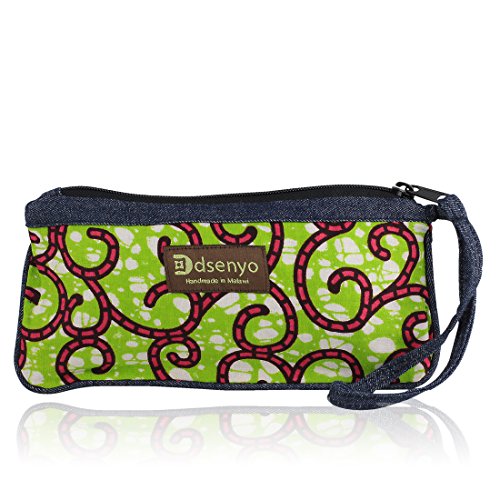 -. Title : Authentic African Hand Made Denim and African Fabric Green Curly Cues Wristlet