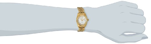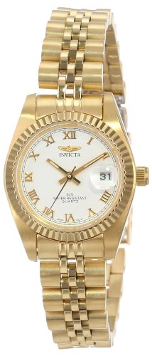 Make a lasting impression when you match this 23 karat gold-plated Invicta Camelot stainless steel women's dress watch with your professional or casual couture. It features a polished finish on the watch case and multi-link bracelet band, and it's topped by a coin-edged raised bezel that frames the white dial face. It also includes Tritnite luminous-tipped markers, baton hands (with seconds hand), and a date window at 3 o'clock with magnifier. Other features include a scratch-resistant mineral crystal and water resistance to 30 meters (99 feet)--enabling it to withstand splashes and accidental dunks into the water, but not suitable for swimming.II Collection
