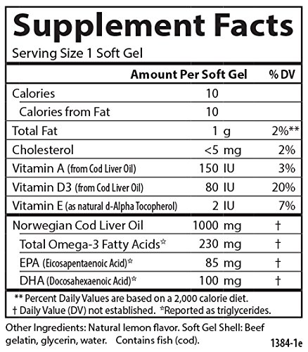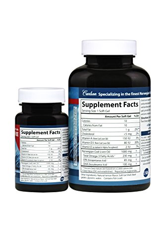 Cod Liver Oil Lemon Bonus Pack 15030 SoftgelFrom the deep, pristine waters near Norway, Carlson provides the finest cod liver oil, naturally rich in EPA and DHA, and supplying Vitamins A and D. Natural Vitamin E has been added to each Carlson Labs Norwegian Cod Liver Oil 1000 mg softgel to protect the freshness of EPA and DHA, both within the softgels and our bodies. Carlson Labs Norwegian Cod Liver Oil Gems Lightly Lemon promotes a healthy heart, arteries, joints, brain-nerve function and bone strength. Carlson Labs Norwegian Cod Liver Oil Gems provides a light-lemon clean taste inside each softgel.