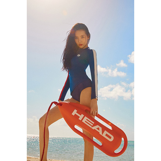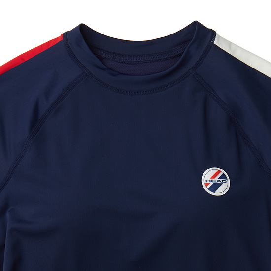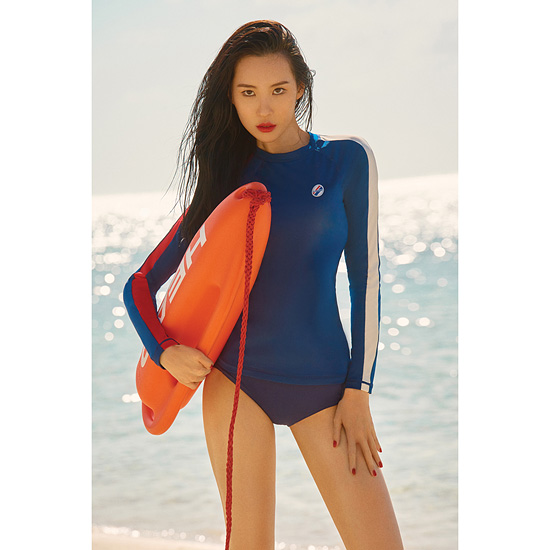 - 어깨선과 슬리브에 배색 라인으로 포인트를 준 여성 래쉬가드.
